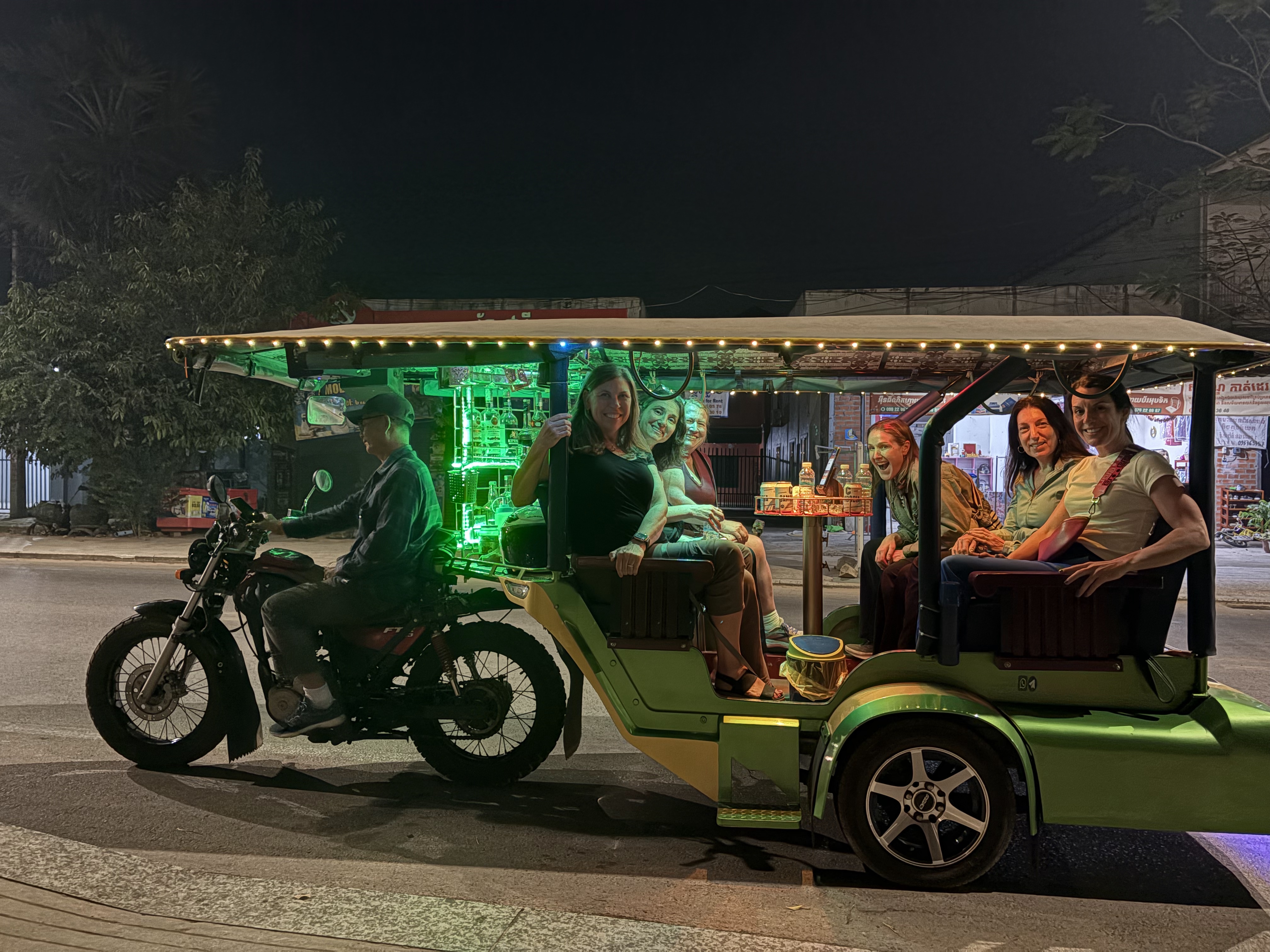 Tuk tuks are motorized open-air taxis that provide a unique and exhilarating way to explore the streets of Siem Reap. An unexpected highlight during one of our adventures was coming across a karaoke tuk tuk, which turned out to be a fun surprise. There is truly nothing like belting out “Girls Just Wanna Have Fun” while we zipped through Pub Street in Siem Reap with a cold $1 Cambodian beer in one hand and a microphone in the other.