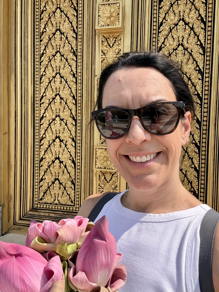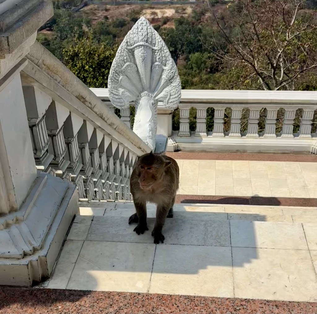 I carried our group’s flowers to leave as an offering at the shrine. We started the climb up the steps to Ta San Mosque. The views were stunning but the carvings and intricate designs were even more impressive. You had to keep your wits about you as there were a few overly friendly monkeys roaming about.