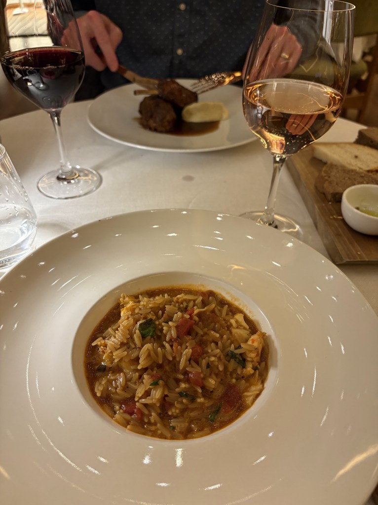 We had dinner at the NEW hotel’s Art Lounge restaurant on the rooftop. The manager helped us pair Greek wines with our meal. We enjoyed a traditional Greek salad and octopus for appetizers. I had a seafood risotto for my main. We shared dessert with complimentary ouzo.