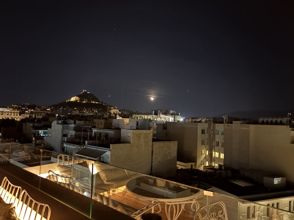 The NEW hotel is modern and artsy. It is conveniently located within walking distance of the main tourist attractions, shops, etc.. During our stay, we enjoyed complimentary breakfast at their lobby restaurant and had dinner at the rooftop restaurant. Here are some photos to illustrate how close the hotel is to the main sights of Athens. The Acropolis and Lycabettus Hill can be seen from the hotel’s rooftop.