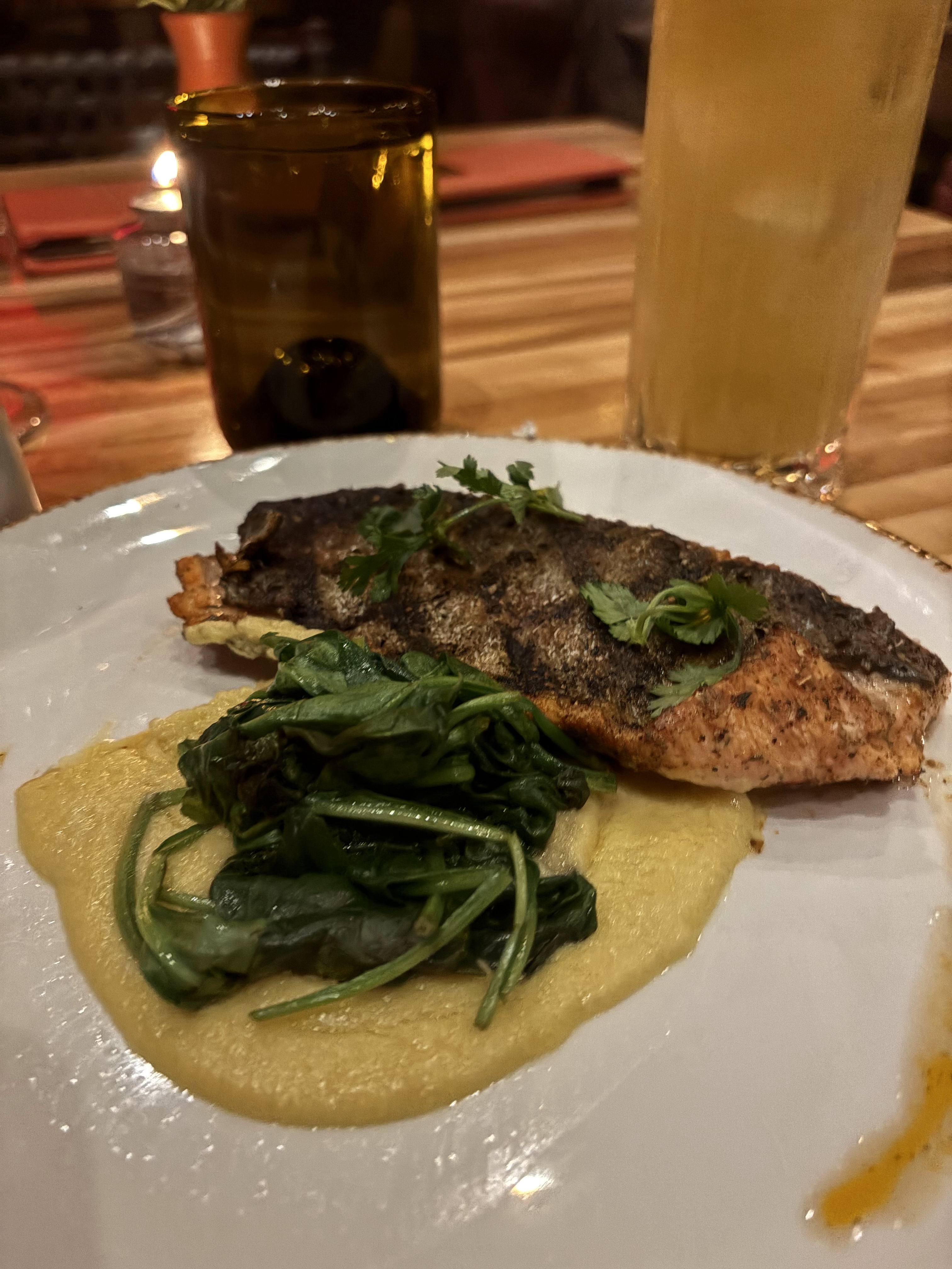 I’m glad we made a dinner reservation at Enchantment. After a day of travel and our first hike, we were happy to walk over to Tii Gavo for dinner. Tii Gavo, meaning gathering place, had a lively atmosphere. The highlights of the meal were the Dirty Verde margarita and the chopped salad. This salad was amazing, featuring mixed greens, poblano buttermilk dressing, roasted corn, pepitas, piquillo pepper, cotija, and avocado. The corn fritters and trout were well-prepared too, but the salad stole the show, making this a memorable meal.