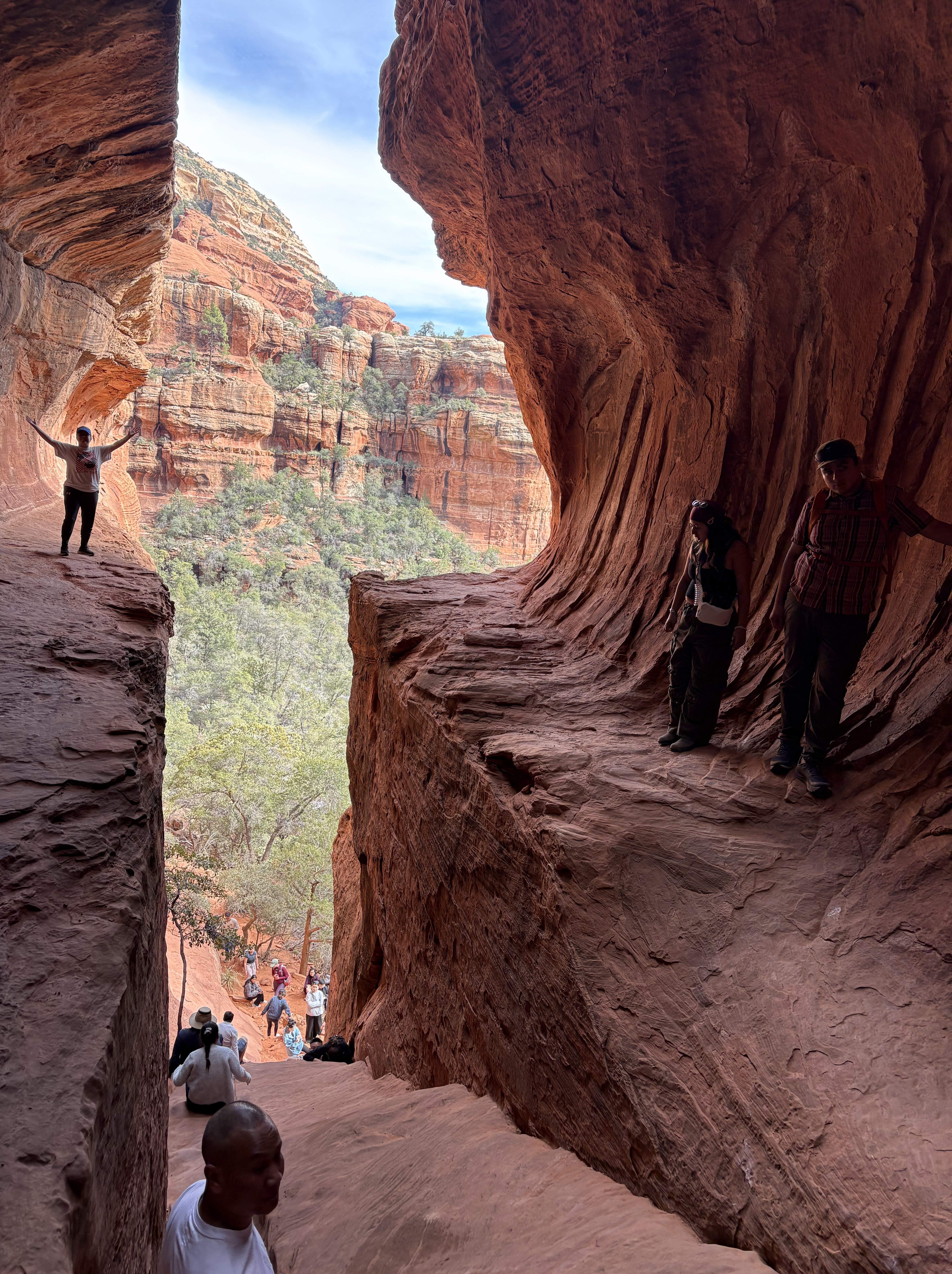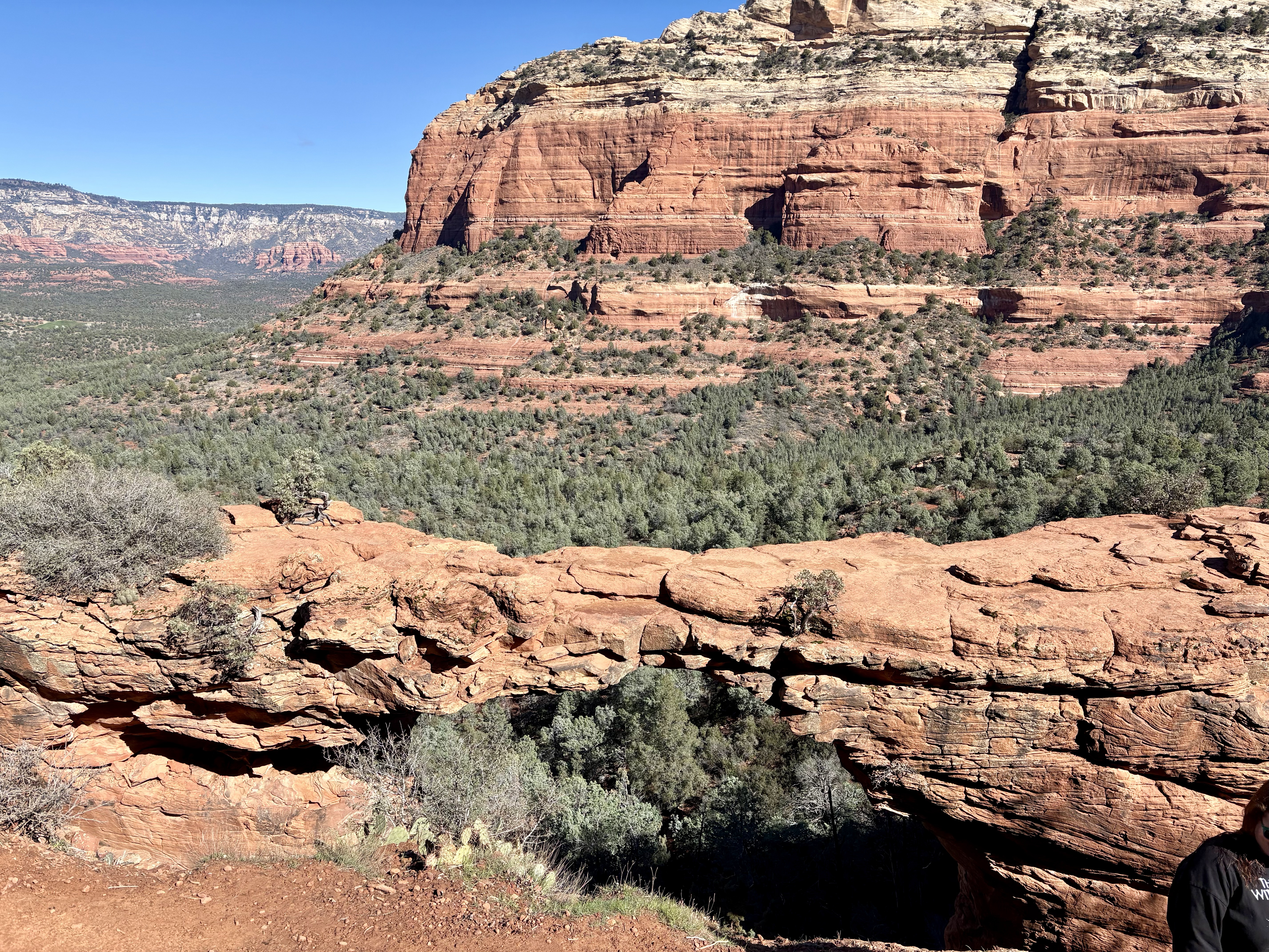 It is much wider than it appears to be. Otherwise, there was no way I would have mustered the courage to venture out there. I love these photos that perfectly capture the rich hues of the red rocks and the greenery of the forest, and the bright blue sky.