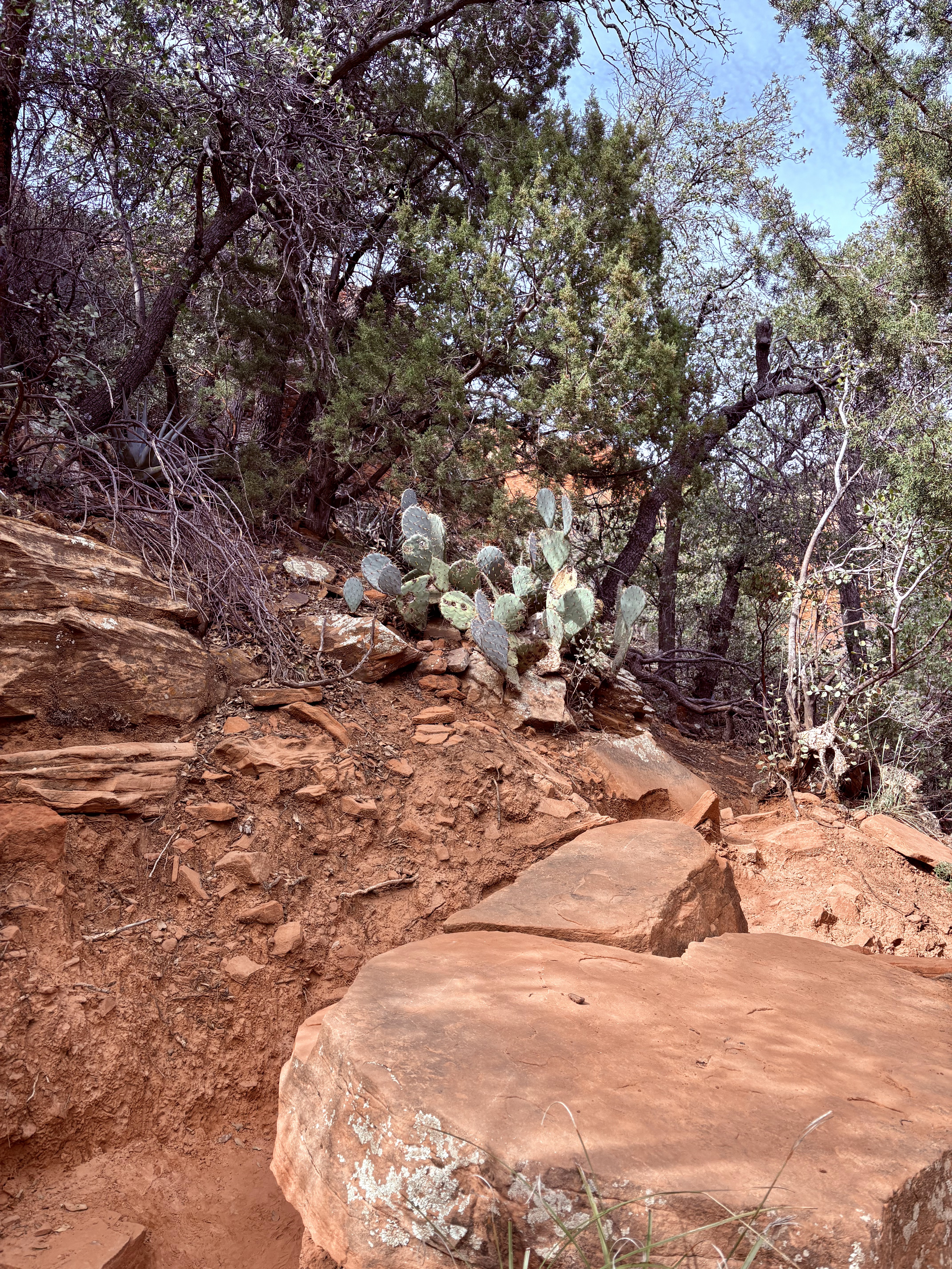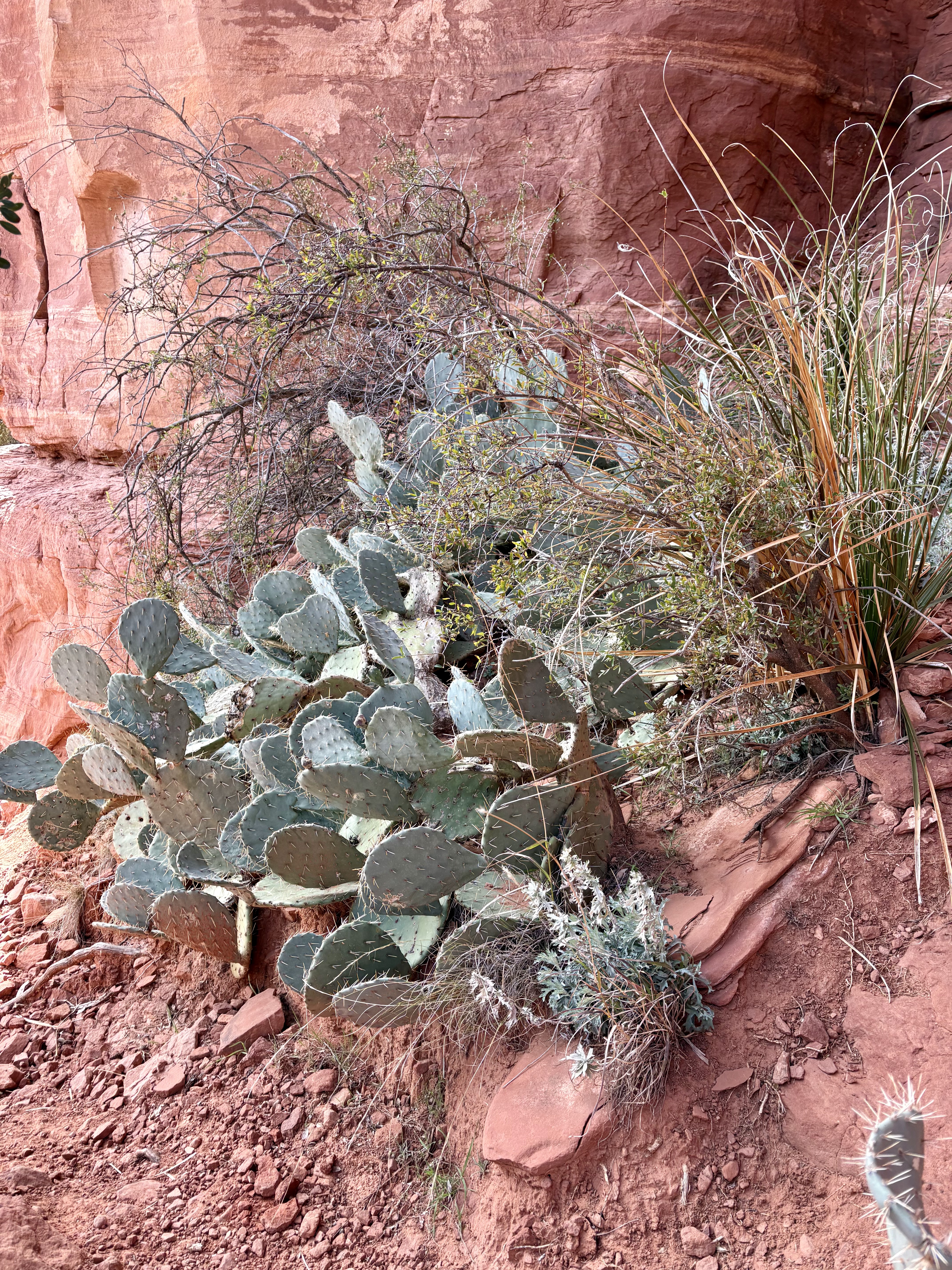 Since we had a few hours before checking in at Enchantment, we stopped at Bell Rock, just south of Sedona. Unlike Phoenix, which has many tall saguaro cacti, the Coconino National Forest is known for its red rock scenery and smaller cacti, like the prickly pear shown below. Bell Rock offered a pleasant flat walk after our five-hour flight and two-hour drive.